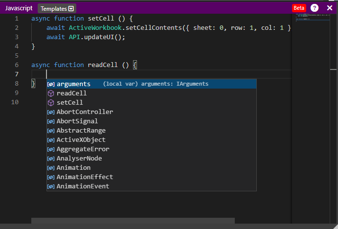 ActiveWorkbookYou can also read and write values from/to a cell.A Context menu can be opnened via Ctrl+Space as in most code editors. this menu helps you as you know it from your favourite IDE.